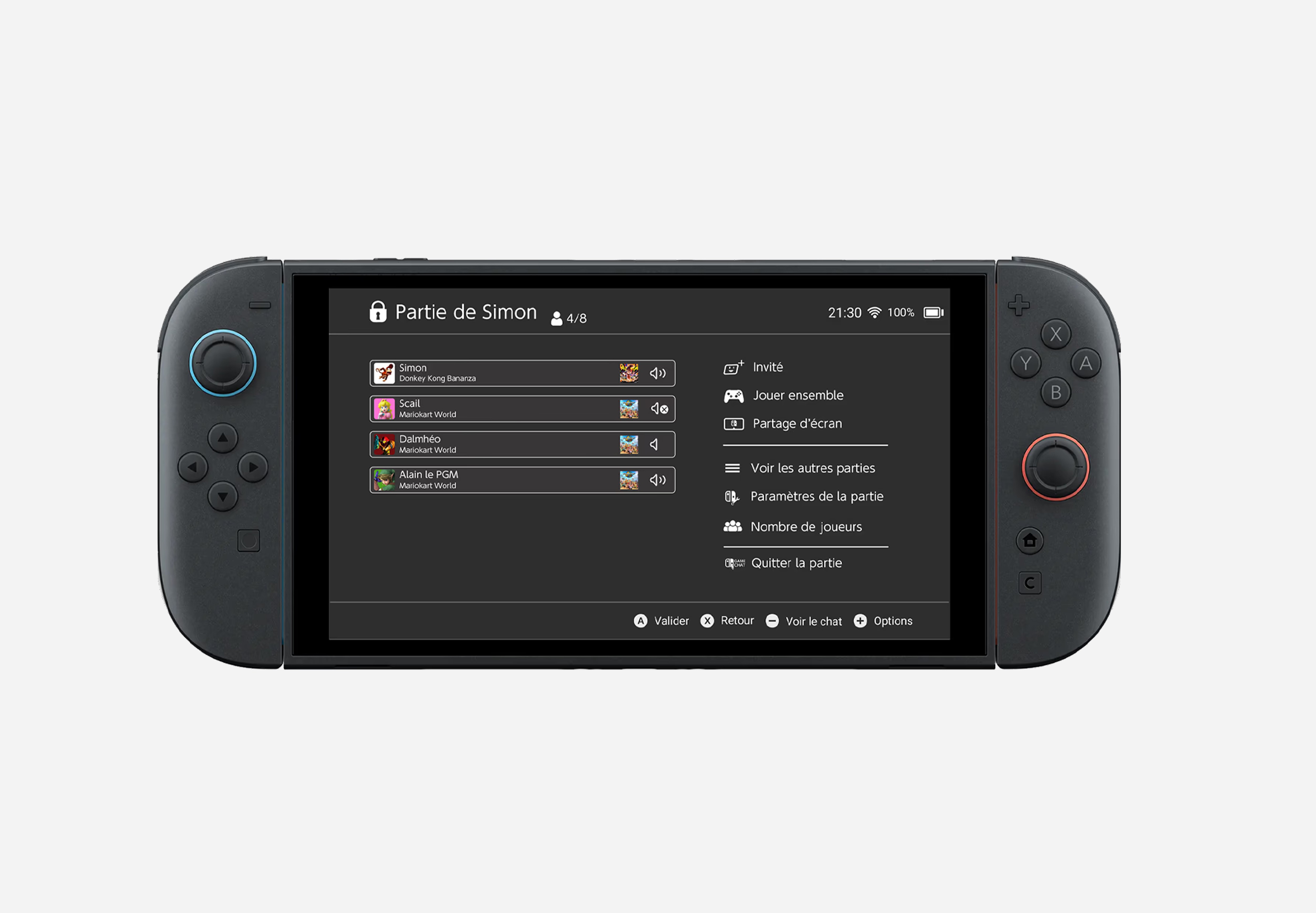 La conception de l’interface utilisateur s’est concentrée sur une expérience fluide, intuitive et cohérente avec l’identité visuelle de Nintendo. J’ai développé une UI épurée mettant en avant l’accessibilité du GameChat, avec des interactions rapides et peu intrusives pour ne pas perturber le gameplay. L’interface propose des overlays discrets, une navigation simplifiée et des indicateurs visuels clairs pour gérer les conversations en temps réel.